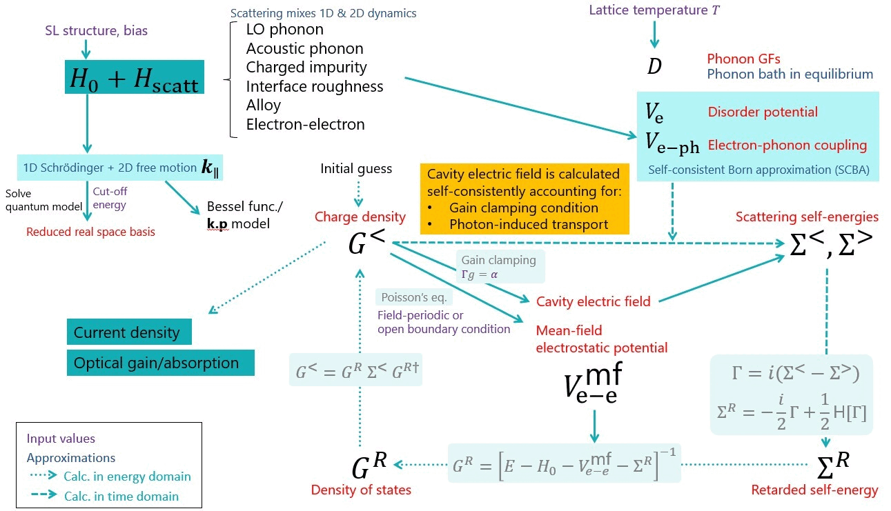 Secondly, the scattering coupling terms are calculated for each of the accounted mechanism (optical and acoustic phonons, charged impurities, interface roughness, alloy disorder, and electron-electron scattering).
