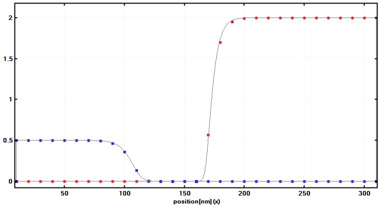 Figure 6 Hole (blue) and electron (red) densities of the p-n junction in units of \(10^{18} cm^{-3}\). The gray lines are from simulations using a 1 nm grid spacing. The squares are from a simulation that uses only a 10 nm grid resolution. Note that the center coordinate of this plot is x=160 nm. The depletion width for the holes is around wp:math:approx`50 nm, for the electrons it is wn:math:approx`10 nm which is of the order of the grid spacing. Even in this case, the calculated electron density is reasonably accurate.