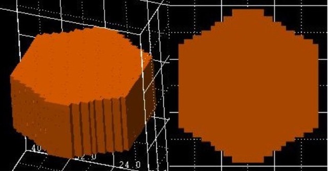 Base and top plane of the hexagonal-obelisk have to be in parallel coordinate planes. These planes are identified by the implicit rule, that a pair of coordinate values (e.g. zmin zmax) has the same value (zmin = zmax). In this example, the plane is in the (x,y)-coordinate plane. The remaining four coordinates specify a rectangle in the corresponding plane.