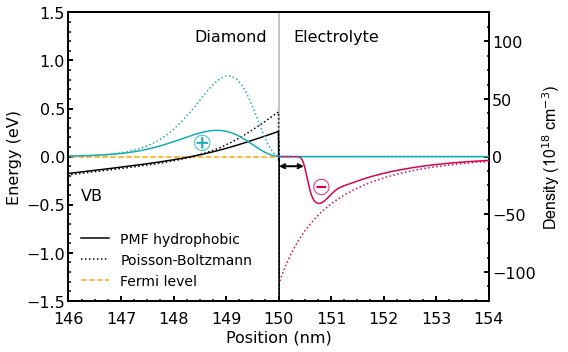 Figure 3.5.2.1 Calculated valence band edge energy (black lines) of the hydrogen-terminated diamond-electrolyte interface for an applied gate voltage \(U_{G} = -0.2~V\). The density of the accumulated holes (light blue lines) is mirrored by the corresponding total ion charge density (net negative charge) in the electrolyte (violet lines). The results of the standard PB calculation are shown in dotted lines whereas the results obtained with the extended PB model are shown in solid lines. The arrow indicates the region of low water density (hydrophobic region).