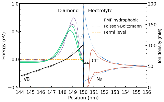 In this tutorial, we use these Poisson-Boltzmann equations to calculate charge distributions at diamond-electrolyte interfaces and reveal the influence of the hydrophobic interface on the distributions.
