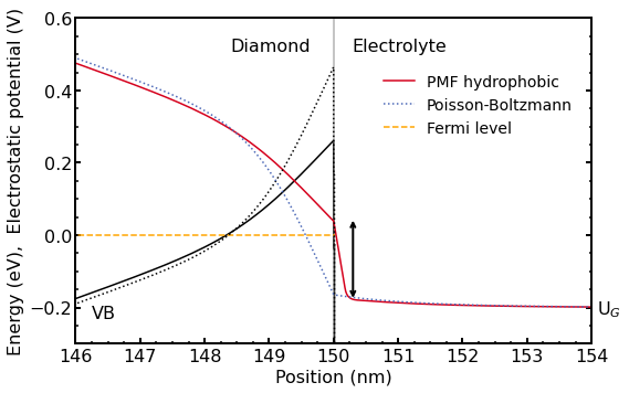 Figure 3.5.2.3 Calculated electrostatic potential and valence band edge (black lines) of the hydrogen-terminated diamond-electrolyte interface under the same situation as in the previous figures. The arrow indicates the large potential drop in the electrolyte region for the hydrophobic model (red solid line). The potential drop in the electrolyte for the standard PB model (blue dotted line) is much smaller. The results of the standard Poisson-Boltzmann calculation are shown in dotted lines whereas the results obtained with the new extended Poisson-Boltzmann model are shown in solid lines.