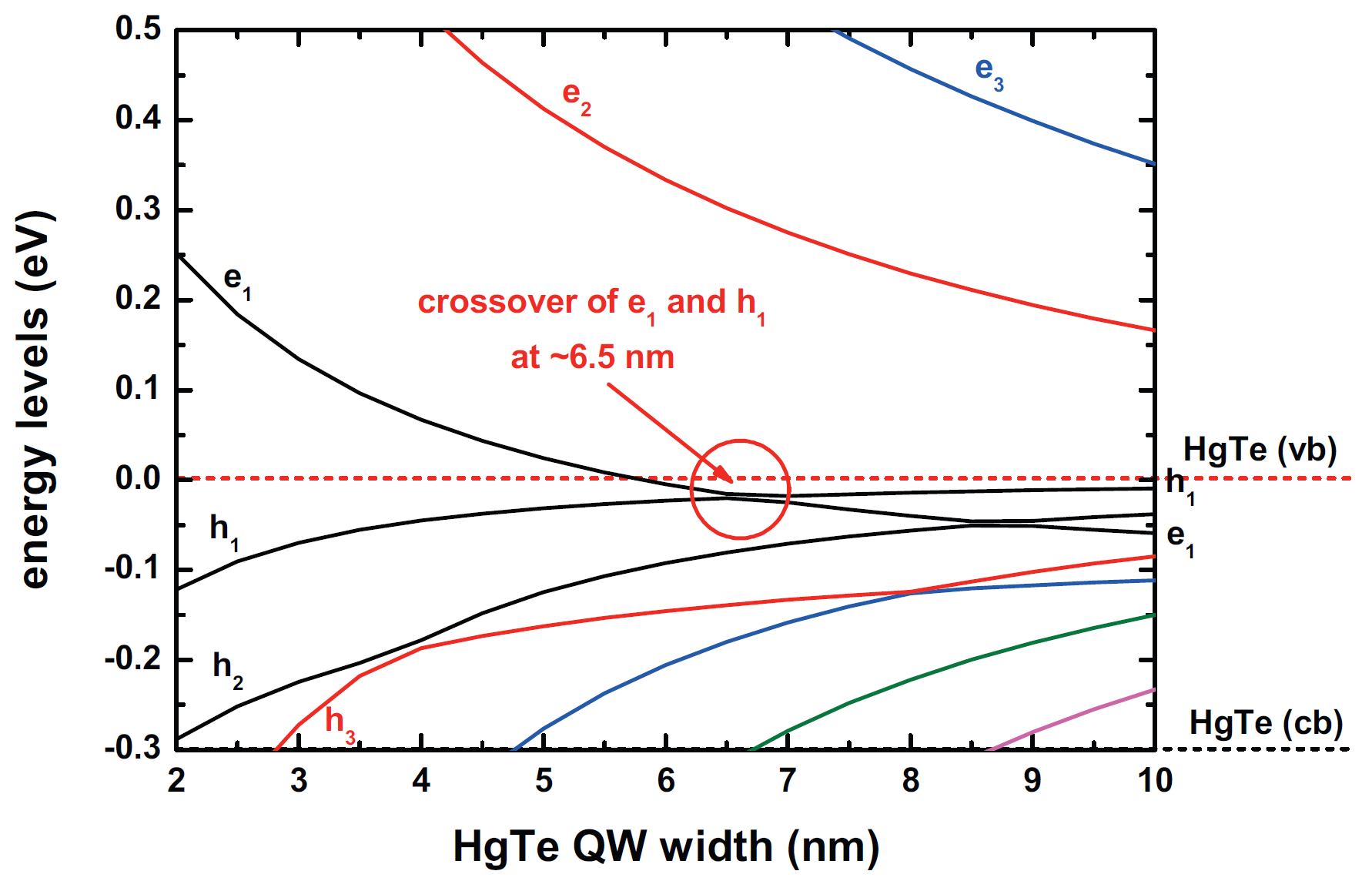 Figure 3.3.4.3 Calculated energies of the electron and hole states in a HgTe-CdTe quantum well as a function of HgTe QW width (8-band \(\mathbf{k} \cdot \mathbf{p}\)). The crossover of normal to inverted band structure occurs around 6.5 nm and corresponds to the situation in Figure 3.3.4.1. The dashed lines indicate the conduction and valence band edges of the HgTe QW.