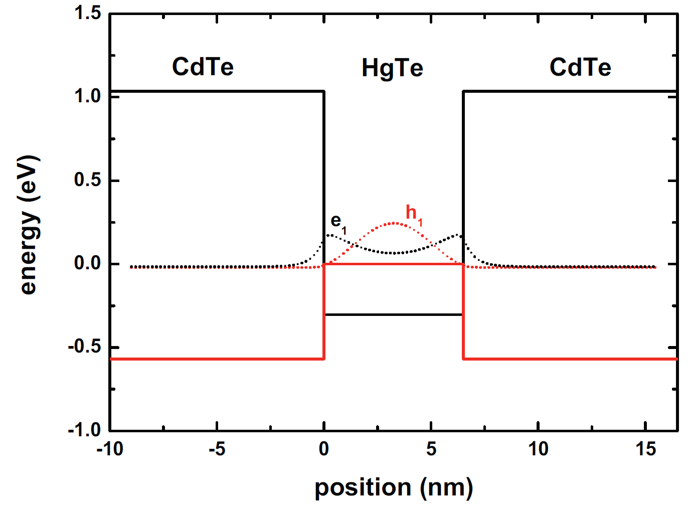 Figure 3.3.4.1 Probability density of the lowest electron (e1) and highest hole (h1) eigenstates of a 6.5 nm HgTe quantum well calculated with the \(\mathbf{k} \cdot \mathbf{p}\) method. In the \(\mathbf{k} \cdot \mathbf{p}\) method, the eigenstates correspond to envelope functions. The conduction (black solid line) and valence band edges (red solid line) form a type-III band alignment.