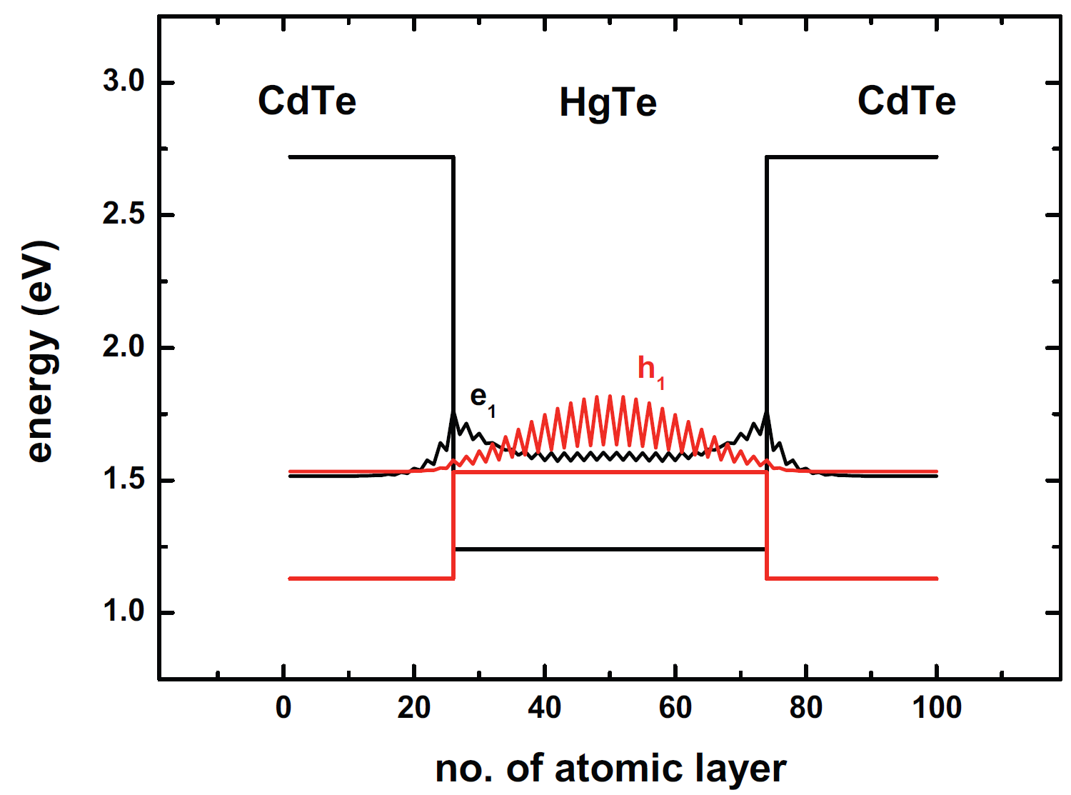 HgTe is an interesting material for studies of the intrinsic spin Hall effect [Brüne2010] and the quantum spin hall effect [Bernevig2006], or spin splitting effects in general due to its large Rashba-type spin-orbit splitting. HgTe is a zero-gap semiconductor that can be embedded between CdTe layers to form a HgTe-CdTe quantum well (QW) heterostructure which shows an interesting type-III band alignment where the valence band edge in the HgTe QW lies above its conduction band edge. Due to this band alignment it is not possible to apply a single-band Hamiltonian. Thus a \(\mathbf{k} \cdot \mathbf{p}\) or tight-binding approach is required. Large HgTe quantum wells have an inverted band structure where the highest hole state (h1) lies above the lowest electron state (e1). For smaller quantum well widths, the quantum confinement increases and below a critical well width, the band structure becomes normal again with the electron state above the hole state. Figure 3.3.4.1 shows the square of the calculated \(\mathbf{k} \cdot \mathbf{p}\) wave functions of e1and h1at the crossover well width at 6.5 nm. Increasing the well width shifts the e1 state below the h1 state. This is shown in Figure 3.3.4.2 where the probability density of the relevant states have been calculated with the empirical tight-binding method for a 7.8 nm HgTe quantum well. One can nicely see that in the tight-binding method the envelope of the probability density corresponds to \(\mathbf{k} \cdot \mathbf{p}\) envelope functions. For the sp3d5s* tight-binding [JancuPRB1998] calculations, we used a valence band offset of 0.4 eV. For the \(\mathbf{k} \cdot \mathbf{p}\) calculations, we took exactly the same material parameters as in Ref. [Novik2005], including their valence band offset of 0.570 eV. In both cases, we neglected strain effects for simplicity.