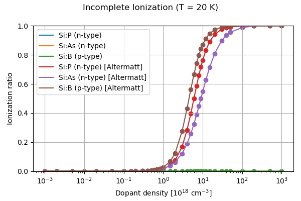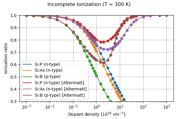 This tutorial tries to reproduce Fig. 5 of [AltermattII2006]. We use the incomplete ionization model of Altermatt et al. of References [AltermattI2006] and [AltermattII2006]. The relevant keywords and models are described in $impurity-parameters.