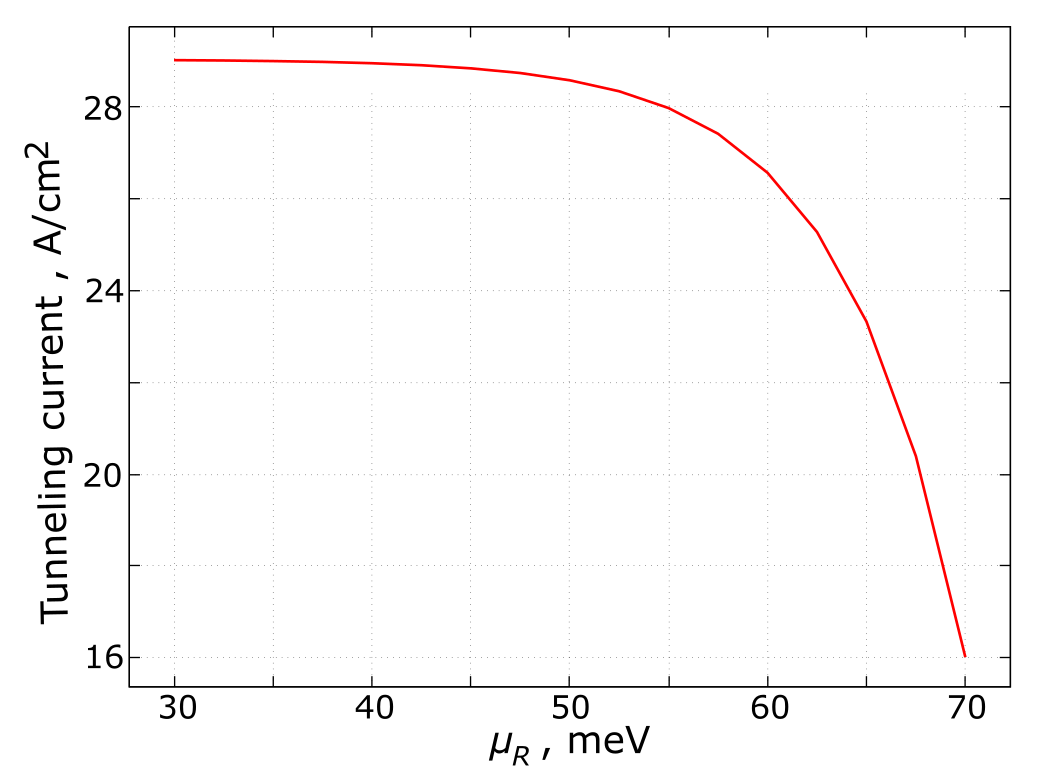 Figure 3.4.4.5 Dependence of the tunneling current on the chemical potential \(\mu_R\) at \(T=0 {\rm~K}\) at fixed value of \(\mu_L = 75 {\rm~meV}\). The DC bias is \(V_{dc} = \mu_L - \mu_R\). The length of the connecting wires has been chosen as 1 nm. Other parameters are the same as in Figure 3.4.4.3.