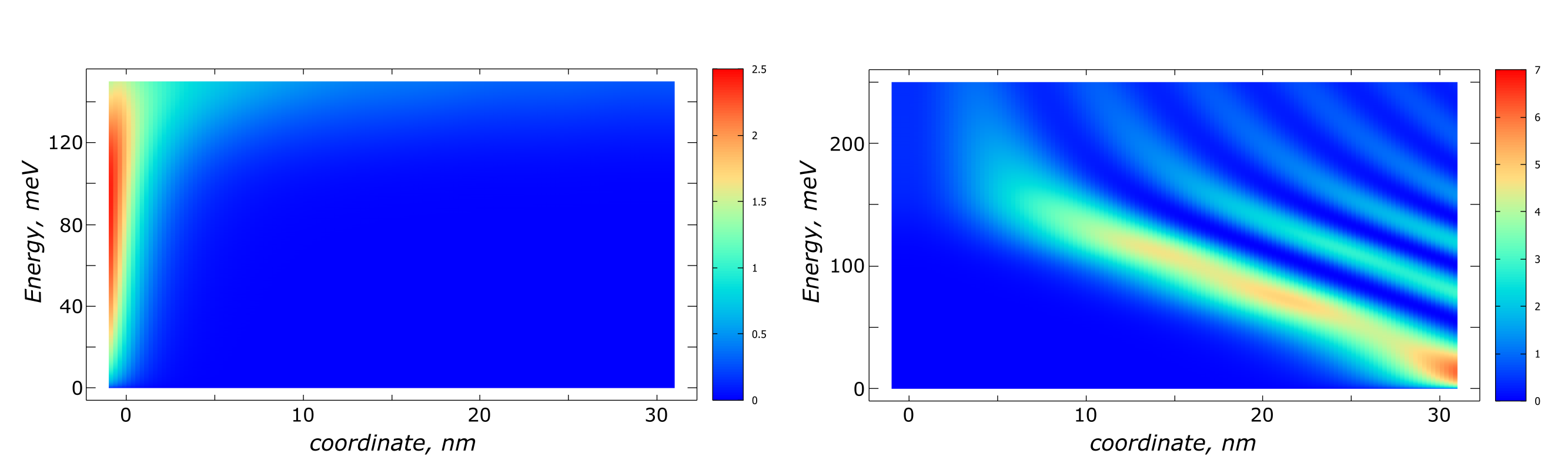 Figure 3.4.4.4 Local Density of states which illustrates how lead modes enter the device when only one lead (the left/right lead in the left/right panel) is connected. Mind the different scale of the color scheme in the left and right panels.