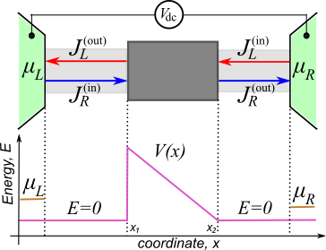 If one considers the tunneling current along one axis and the semiconductor structure is assumed to be homogeneous along the other two directions, simulations can be reduced to effectively one-dimensional Landauer-like setup, see the upper panel of Figure 3.4.4.2, where the device is connected to two leads with different chemical potentials. The current flows from the material with a larger chemical potential to that with a smaller one.