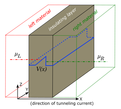 Figure 3.4.4.1 Sketch of a setup for the tunneling current in the Fowler-Nordheim theory. Left (red lines) and right (green lines) materials with different chemical potentials, \(\mu_{L,R}\), are separated by an insulating layer (brown region) which makes a potential barrier (blue lines). Everything is homogeneous in {y, z}-directions. The tunneling through the potential barrier occurs in x-direction.