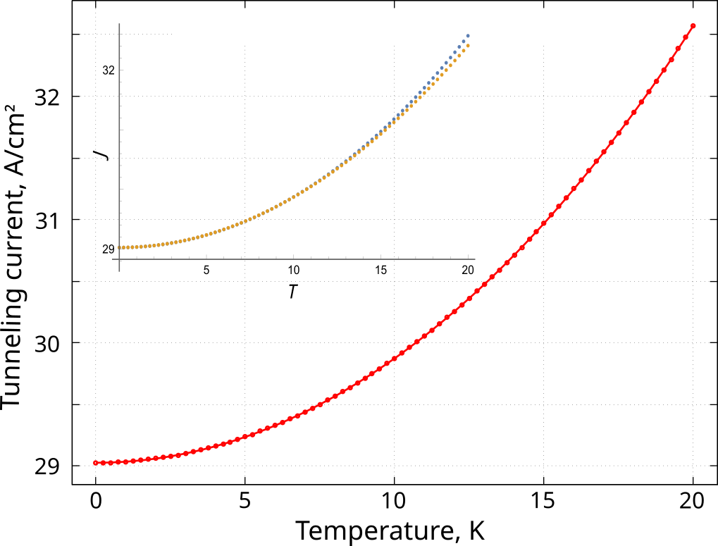 The finite temperature changes the energy distribution of the electrons in the leads which results in a temperature-dependent contribution to the tunneling current, see the main panel of Figure 3.4.4.6. The Fowler-Nordheim theory predicts that \(J(T) \simeq J(T=0) ( 1 + (T/T_c)^2 + O\left[(T/T_c)^4\right])\) with \(T_c = \sqrt{3} e F \, \hbar \, / 2 \pi k_B \sqrt{m^* \phi}, \ T / T_c \ll 1\), and \(k_B\) being the Boltzmann constant.