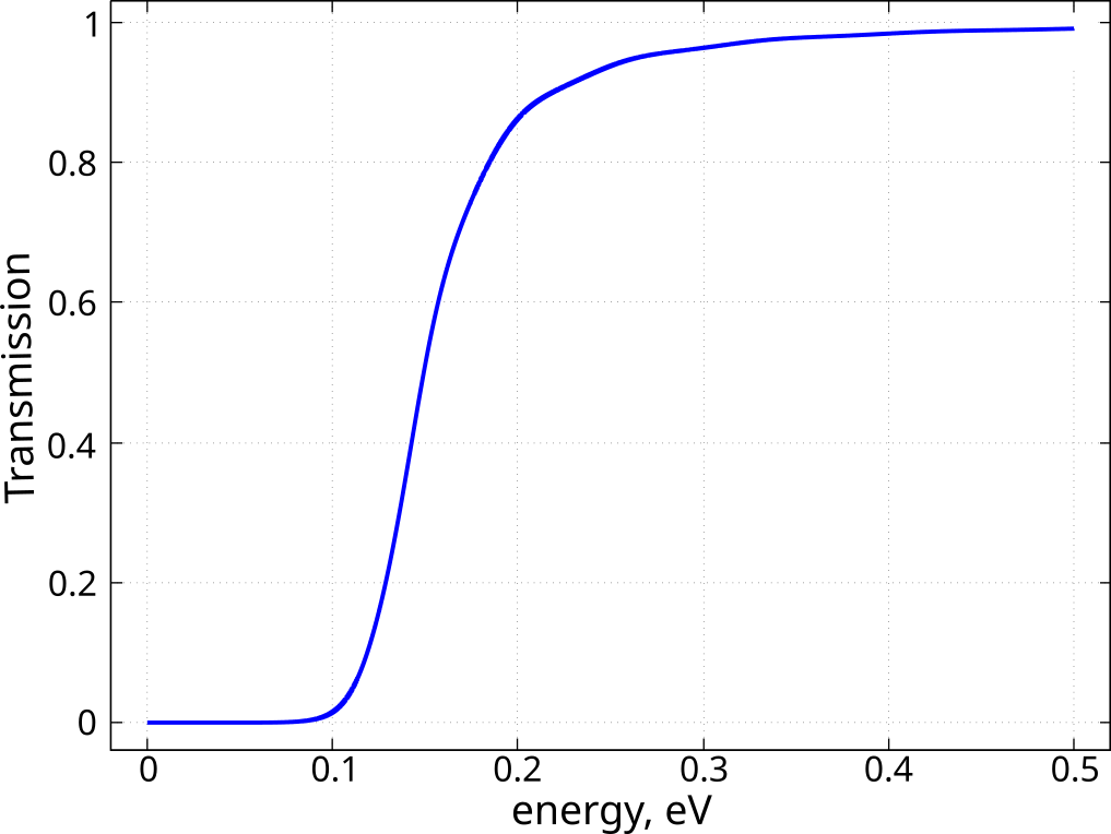 \({\cal T}\) can be found analytically for the one-dimensional triangular barrier, see, e.g., secton in the book by Shi-Dong Liang [Shi-Dong-Liang]. In a general case, one can use either approximate analytical methods, like WKB, or calculate the transmission probability numerically by solving the Schrödinger equation. We have used Contact Block Reduction method [CBR] for numerical simulations, see also tutorial. Results of the CBR based simulations are shown in Figure 3.4.4.3.