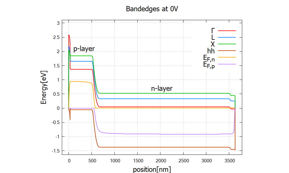 Figure 3.20.7.1 Band edges and quasi-Fermi levels of the solar cell at zero bias bias_000000/bandedges.dat (nextnano++) / band_structure/BandEdges.dat (nextnano³)