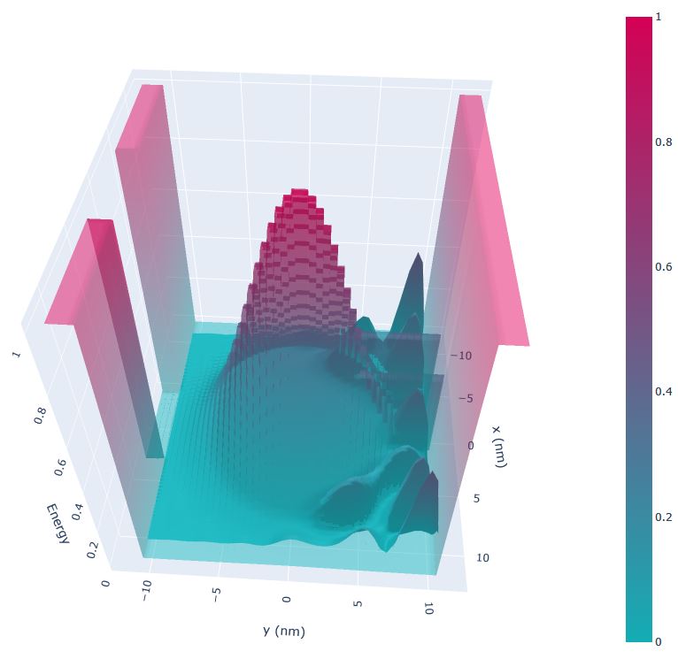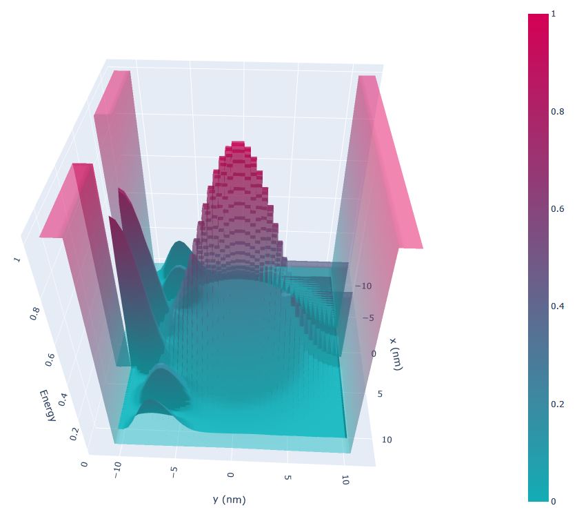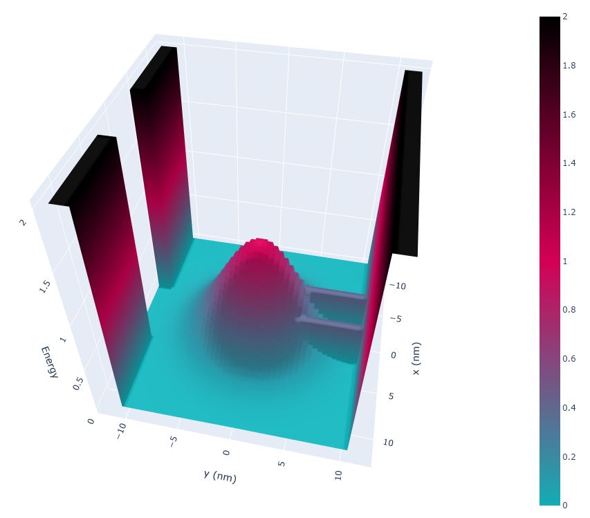 The image below shows the 3-dimenional conduction band edge. Note that the height of the infinite potential barriers are set to \(2.0\;\mathrm{(eV)}\) for convenience.