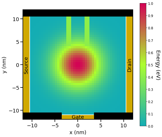 where \(E_{c,0} = 1.0\;\mathrm{(eV)}\) so that the maximum height of the Gaussian barrier becomes \(1.0\;\mathrm{(eV)}\) at the center of the device. In this tutorial, \(a\;=\; 5\;\mathrm{(nm)}\).