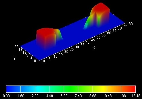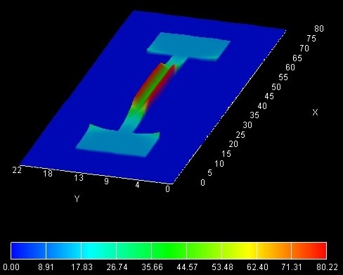 In Figure 3.20.28.5 the electron density inside the MOSFET structure at \(0.2\,\mathrm{V}\) is shown. The corresponding data is contained in the file bias_00002\density_electron.avs.fld. One can clearly see that the electron density has the highest values at the \(\mathrm{Si}-\mathrm{SiO}_2\) interfaces.