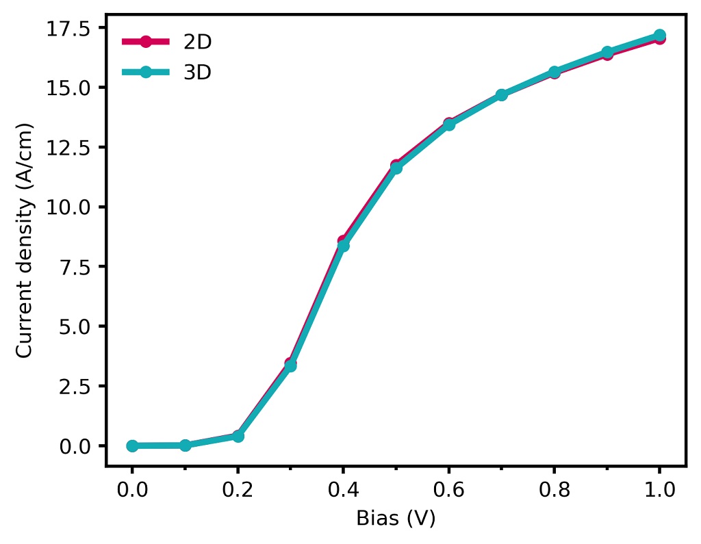 Figure 3.20.28.7 Comparison of the current-voltage characteristics between 2D and 3D simulations.
