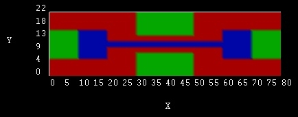The material regions defined in the input file for the nextnano++ simulations are shown in Figure 3.20.28.2. The blue squares (Si) are n-doped with a concentration of \(1\cdot 10^{20}\,\mathrm{cm^{-3}}\). The 2 nm channel is n-doped with the same concentration from 20 nm to 30 nm and from 50 nm to 60 nm.