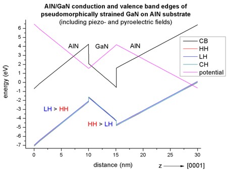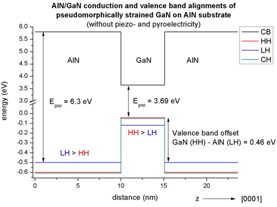 Figure 3.20.31.1 shows the conduction and valence band edge alignment in AlN/GaN structures (unstrained). In AlN, the light hole (LH) is the highest valence band whereas in GaN, this is the heavy hole (HH). We assumed a valence band offset of VBO = 0.5 eV, the conduction band offset is much larger (CBO = 2.3 eV). All material parameters are based on [Andreev2000] although meanwhile better parameters are available.