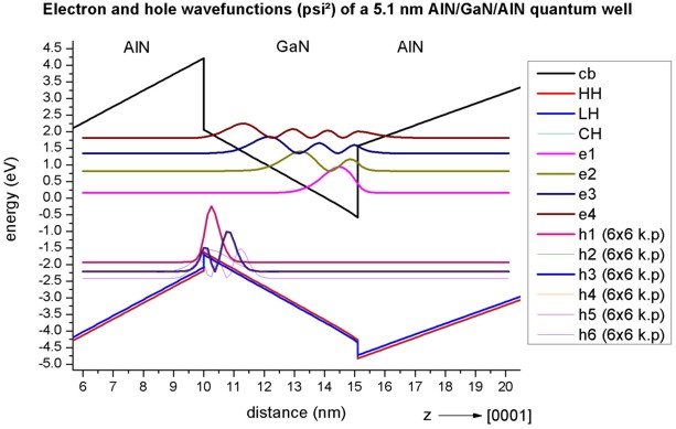 Figure 3.20.31.4 shows the electron and hole wavefunctions (\(\Psi^2\)) in a 5.1 nm AlN/GaN/AlN quantum well. For the electrons, the single-band effective-mass approximation was used whereas for the holes the 6-band k.p model was used. The figure shows the four lowest electron eigenstates and the 6 highest valence band eigenstates. All eigenstates are two-fold degenerate due to spin.