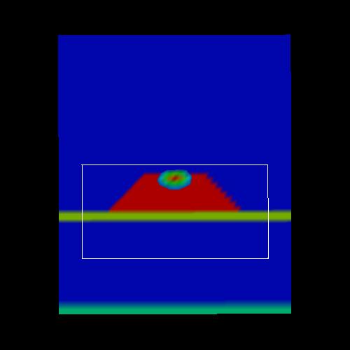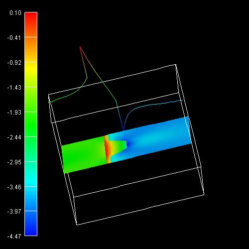 The conduction and valence band edges are shown in Figure 3.20.31.12 and Figure 3.20.31.13. One can clearly see that the conduction band minimum is located in the top of the quantum dot whereas the maximum for the valence band is located inside the wetting layer (WL) (which is equivalent to the bottom of the quantum dot). Thus, one expects the electrons, which are located in the top area of the QD, to be spatially separated from the holes, which are located in the WL (bottom of the QD). The energy scale is in units of [eV]. The figures of the conduction and valence band edges are related to Figs. 5 and 6 in [Andreev2000].