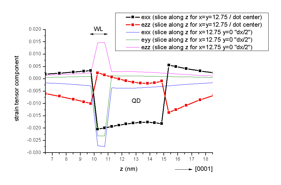 The strain tensor components of a line through the center of the quantum dot along the z axis are shown in Figure 3.20.31.7. This figure is related to Fig. 2 (a) in [Andreev2000].