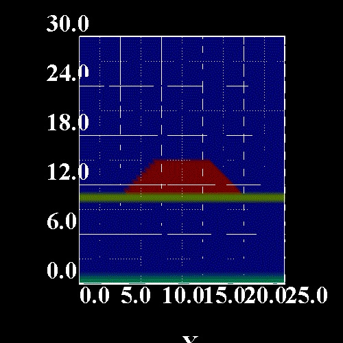The simulated hexagonal GaN quantum dot (height = 4.1 nm) is embedded in an AlN matrix, input file QD_GaN_Andreev_PRB_2000_3D_nnp.in. The wetting layer is 1 nm thick and consists of GaN. The structure and a cross-section of the structure along x-y are shown in Figure 3.20.31.5 and Figure 3.20.31.6, respectively.