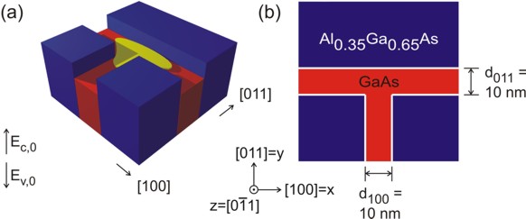 The wave function is indicated at the T-shaped intersection in yellow. Here, the wave function can extend into a larger volume (as compared to the quantum well) and thus reduce its energy. Quantum mechanics tells us that the ground state can be found at this intersection and electrons are only allowed to move one-dimensionally along the \(z\) direction. Figure 3.20.33.1 b) shows a 60 nm x 60 nm extract of the schematic layout including the dimensions, the material composition and the orientation of the wire with respect to the crystal coordinate system.