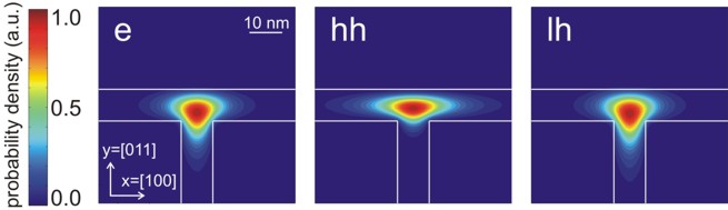 Figure 3.20.33.2 Probability densities of the electron (e), heavy hole (hh) and light hole (lh) state calculated using the effective mass approximation. The wavefunctions are normalized so that the maxima are equal to one.