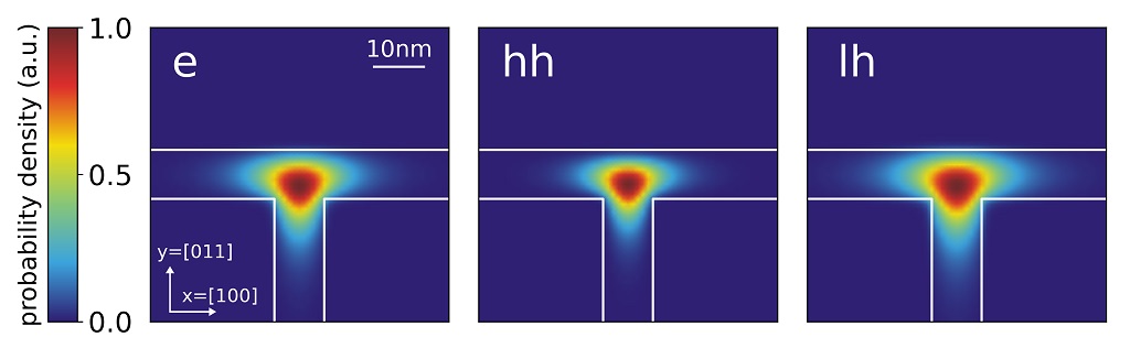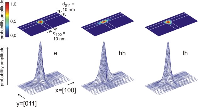 Figure 3.20.33.4 and Figure 3.20.33.5 show the probability densities (\(\psi^2\)) of the ground states of the confined electron, heavy and light hole eigenstates of the quantum wire. The lowest hole state is the heavy hole state and the second hole state is the light hole state. No further hole states are confined. Also, in the conduction band only the ground state is confined. One can clearly see that each ground state wave function is localized at the T-shaped intersection and shows the T-shaped symmetry. Due to the anisotropy of the heavy hole effective mass, the heavy hole wave function prefers to extend along the [100] direction and hardly penetrates into the quantum well that is aligned along the [011] direction. The heavy hole mass along the [100] direction is only half the value as along the [011] direction. The light hole anisotropy is only minor and thus its symmetry resembles the one of the isotropic electron.