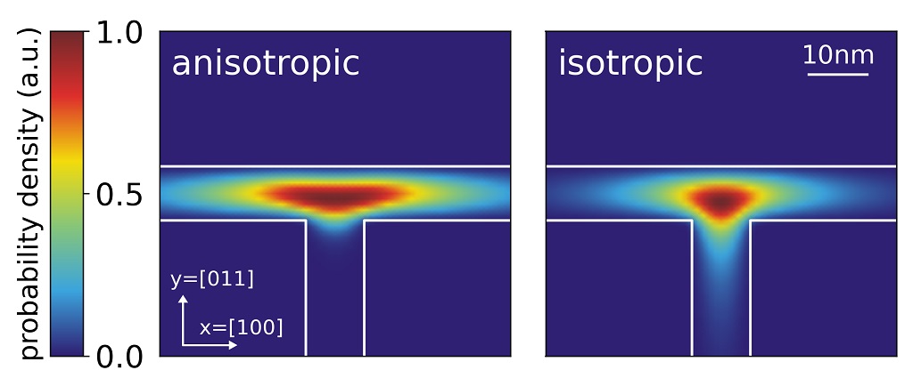 Figure 3.20.33.3 Probability density (\(\psi^2\)) for the hole ground state using anisotropic and isotropic k.p parameters.