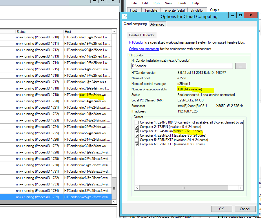 Tools->Options->Cloud computing. If everything is correctly set up, you will find the “HTCondor” section highlighted with green color, and the available computers show up in “Cluster”. If this is not the case, maybe you have not installed HTCondor on the computer where you are running nextnanomat. Please also check that the HTCondor installation path is correctly set within nextnanomat, e.g. the default pathC:\condormight not be the one where you installed HTCondor.