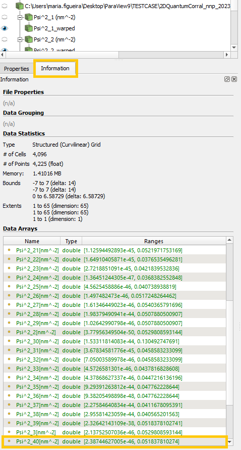 Looking at the Information tab under the Pipeline Browser of ParaView ( Figure 61 ) see a larger number of datasets was actually exported, but only 8 are displayed. This is because we limited to a maximum of datasets to be displayed through the variable MAXIMUM_NUMBER_DATASETS as default in the nn_ParaView_Plotter script.
