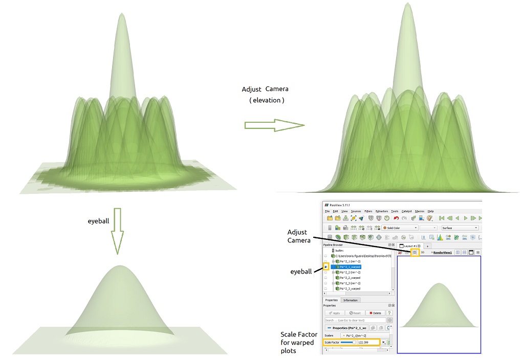 The warped objects are the result of applying the WarpByScalar filter of ParaView to each component, that converts 2D functions in a 3D representation, where the third axis, in this case, corresponds to the value of probability density at each (x,y) in the plane.