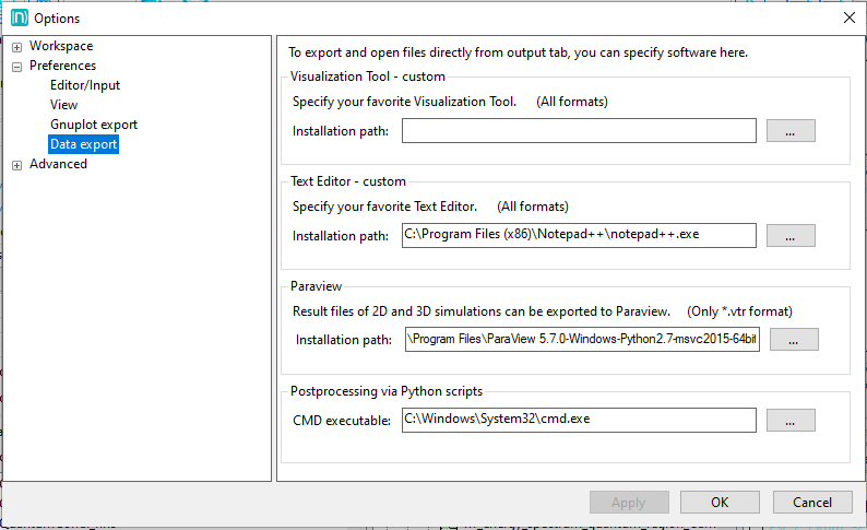 In order to load files in ParaView through Python scripts from nextnanomat it will require the following settings: