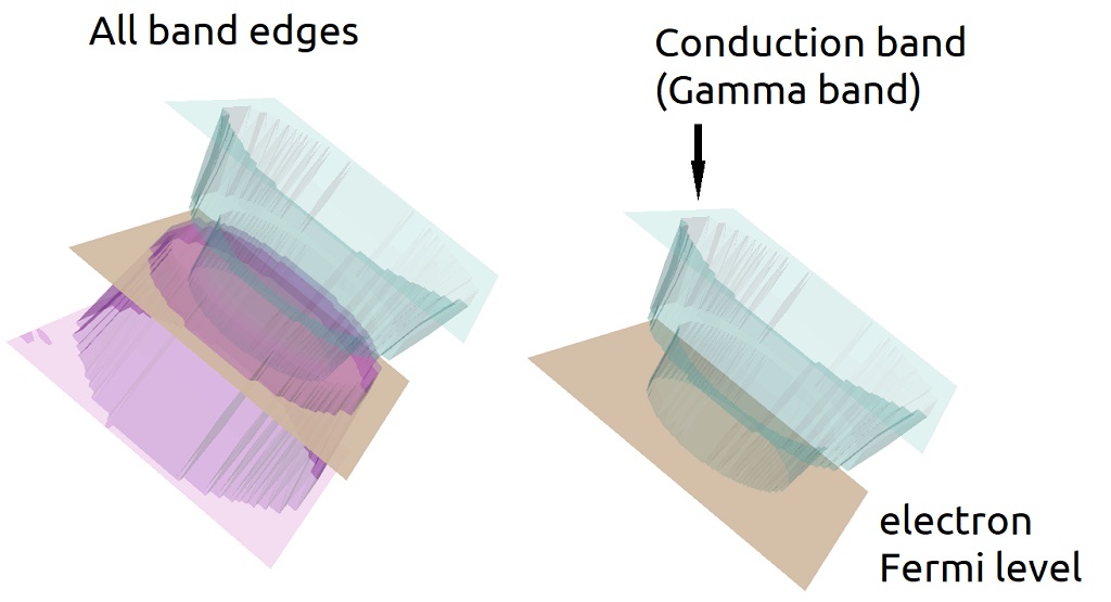 Figure 67 Overlay files are always plotted using a different palette and using semi-transparent surfaces. The Fermi levels are plotted as opaque surface.