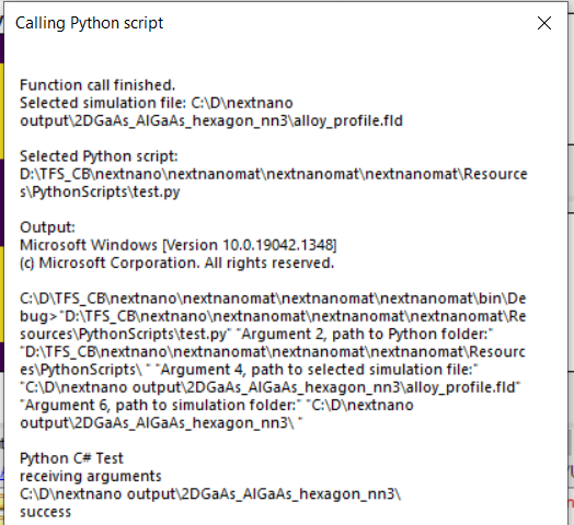 Custom written python scripts can be called directly from the Output tab. The parent folder of the python script, Path to the currently displayed output file as well as the path to the simulation folder are transferred as system arguments, see Figure 75. (If you need other specific information to be exported, just mail your request to the nextnano support team or use the widget on this website.) By using those system arguments in your python script, individual post-processing of specific output files is reduced to a one-click effort.
