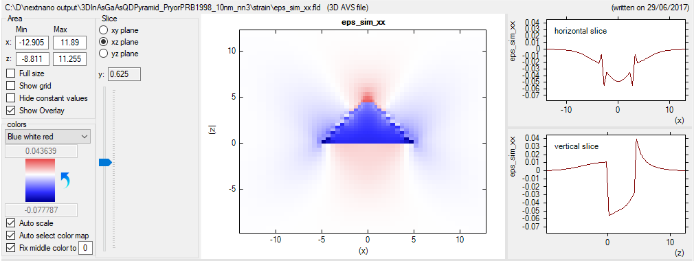 Real three-dimensional plots are not supported by nextnanomat. Instead 2D planes of the 3D data are visualized through heat maps, same as for 2D data. An additional panel allows the selection of the displayed plane (xy, xz or yz) and the position of the slice. This panel can be seen in Figure 31. If three-dimensional visualization is aimed for, we recommend exporting data to ParaView.