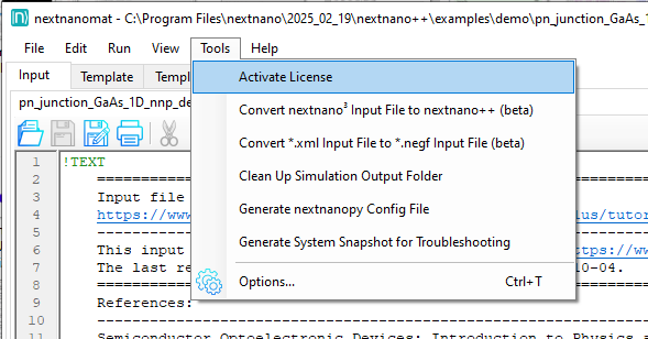 In the Help menu, information about the software and direct links to the nextnano online documentation of each simulation tool can be found. Furthermore, there are a couple of contact possibilities listed, from our customer support portal nextnano Help Center to our social media accounts. If you plan to contact support, the menu function Generate System Snapshot for Troubleshooting generates a text file which you can attach to your request.